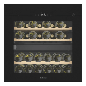 De De Dietrich DIW36DFB is een inbouw wijnkoelkast met twee zones voor het bewaren van 36 flessen (24 in de bovenste zone, 12 in de onderste zone). De temperatuur is per zone instelbaar tussen 5°C en 22°C. De wijnkoelkast heeft een zwarte behuizing en een glazen deur met zwarte omlijsting en push-pull-opening. Drie lagen glas met uv-filter beschermen tegen lichtinvloeden. Het elektronische bedieningspaneel met kinderslot, het witte verlichte display en de led-verlichting met schakelaar maken bediening eenvoudig. Drie uitschuifbare houten planken zorgen voor stabiele opslag. Actieve ventilatie en een antivibratiesysteem behouden de kwaliteit van de wijn. Extra functies zijn automatische ontdooiing en een deur-alarm. De afmetingen zijn 59 cm breed, 59,5 cm hoog en 56,3 cm diep.