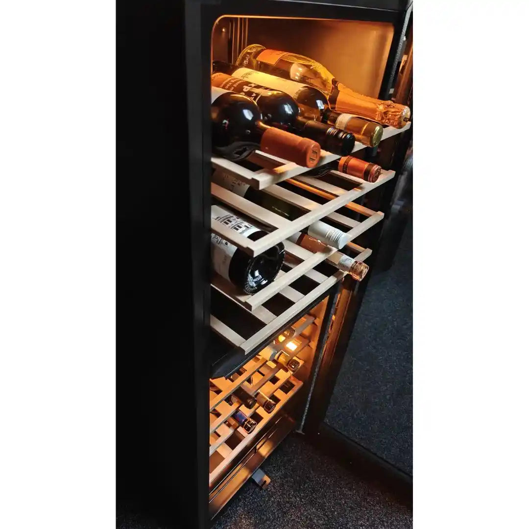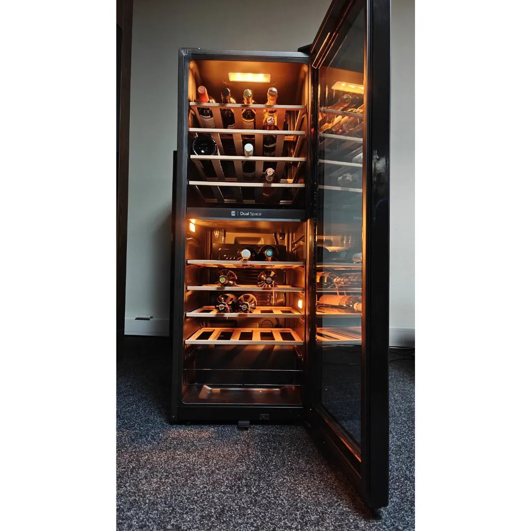 De vrijstaande wijnklimaatkast Haier HWS56GDG biedt plaats aan 56 flessen in twee temperatuurzones van 5-20 °C. De kast is uitgerust met een compressor, houten leggers en UV-beschermende glazen deur. Antivibratiesysteem zorgt voor stille werking (37 dB), het jaarlijkse energieverbruik is 142 kWh (energieklasse G). Afmetingen: 47,5 cm breed, 128 cm hoog, 45,6 cm diep. Humiditeitsniveau blijft tussen 50–80 %, geschikt voor vrijstaand gebruik.